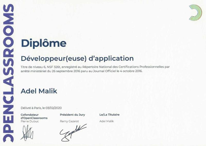 Ma première formation dans la programmation m'a été permis grâce à la bourse d'étude Level-Up d'OpenClassrooms.